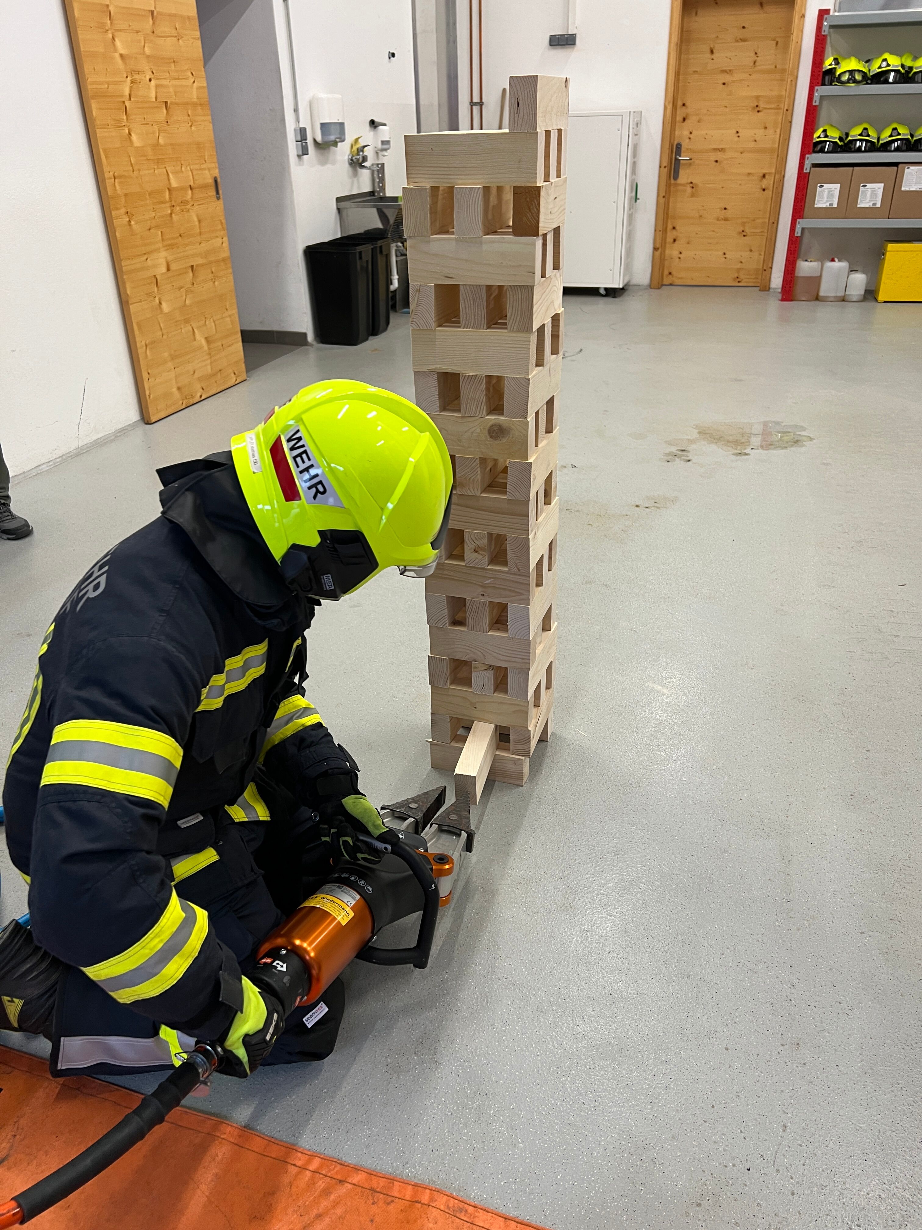 Zugskommandant BM Ernst Ofner erläuterte zuerst einige Details der Geräte und erklärte, worauf bei der Handhabung Acht gegeben werden muss. Als praktischer Part der Schulung wurde noch eine kleine Geschicklichkeitsübung absolviert. Wie bei Jenga mussten Holzblöcke von einem Turm mit Spreizer, Schere oder Stempel entnommen werden und wieder ganz oben am Turm abgelegt werden.