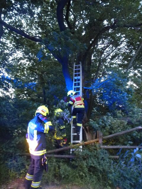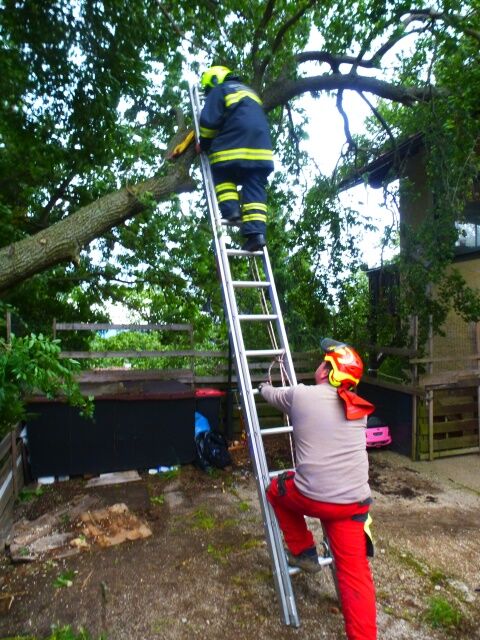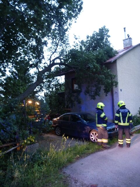 Aufgrund des starken Sturms war ein Baum auf das Dach eines Hauses gestürzt. Bevor mit der Entlastung des Dachs begonnen werden konnte, musste ein geparktes Fahrzeug von dem direkt darunterliegenden Parkplatz weggeschoben werden. In Anschluss wurde der Baum mit Hilfe der Seilwinde gesichert und in kleinen Stücken abgetragen, um weitere Schäden am Haus zu verhindern.