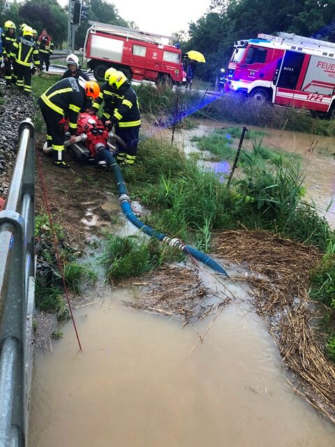 Grund dafür war die Unterstützung der Feuerwehr Dörfles beim laufenden Unwettereinsatz. Wegen der starken Regenfälle am Nachmittag wurden ein Gasthof, ein Reitstall und mehrere angrenzende Objekte überflutet. Mit Tauchpumpen, Tragkraftspritzen und Großpumpen wurde das Wasser von den Gebäuden wegepumpt. Die neben dem überfluteten Bereich verlaufende Bahnstrecke wurde für einige Stunden gesperrt.