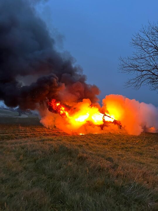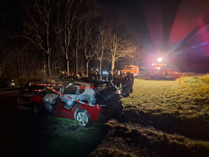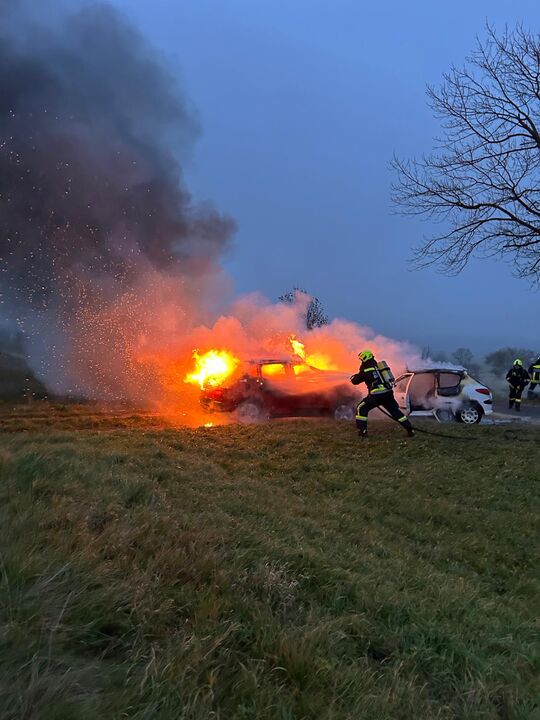 Übungsannahme: Verkehrsunfall mit Fahrzeugbrand, eine eingeschlossene Person im brennenden Fahrzeug.