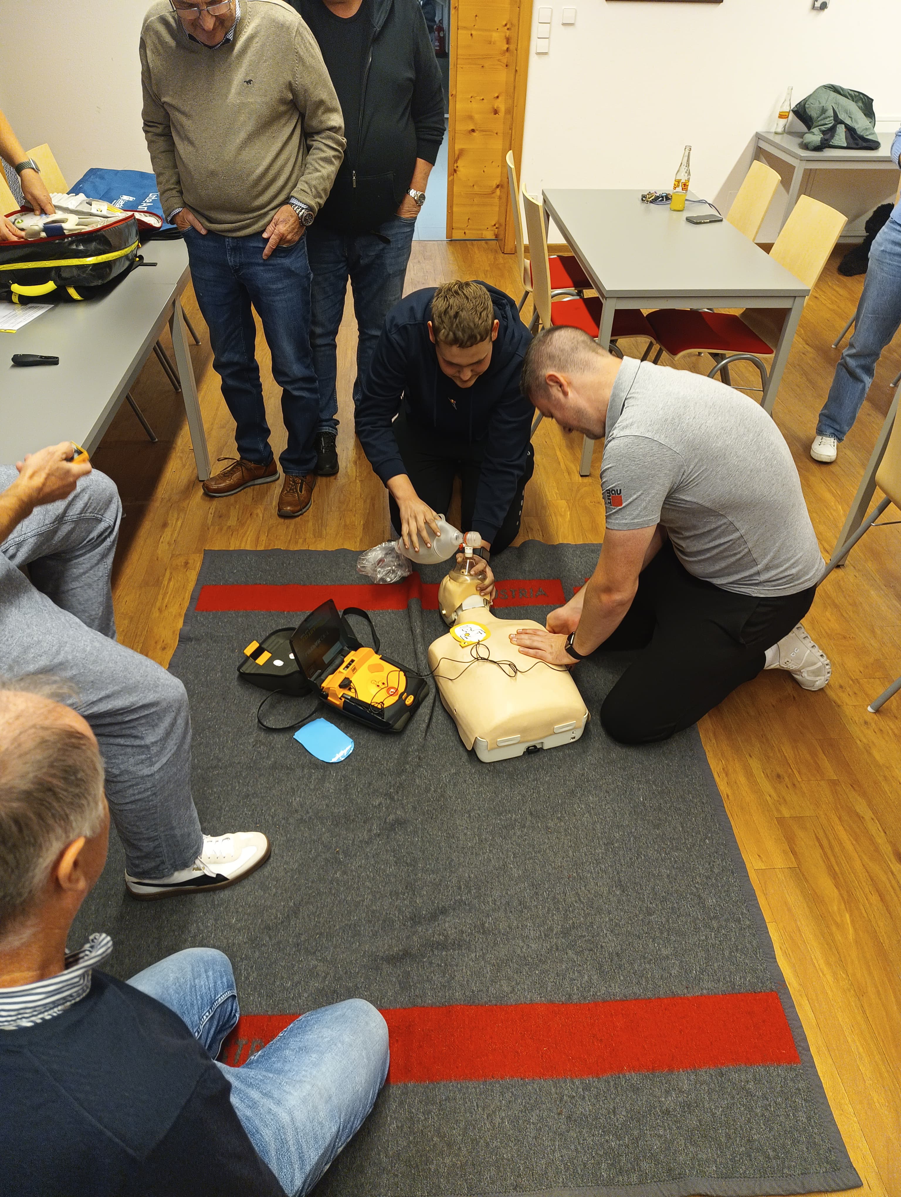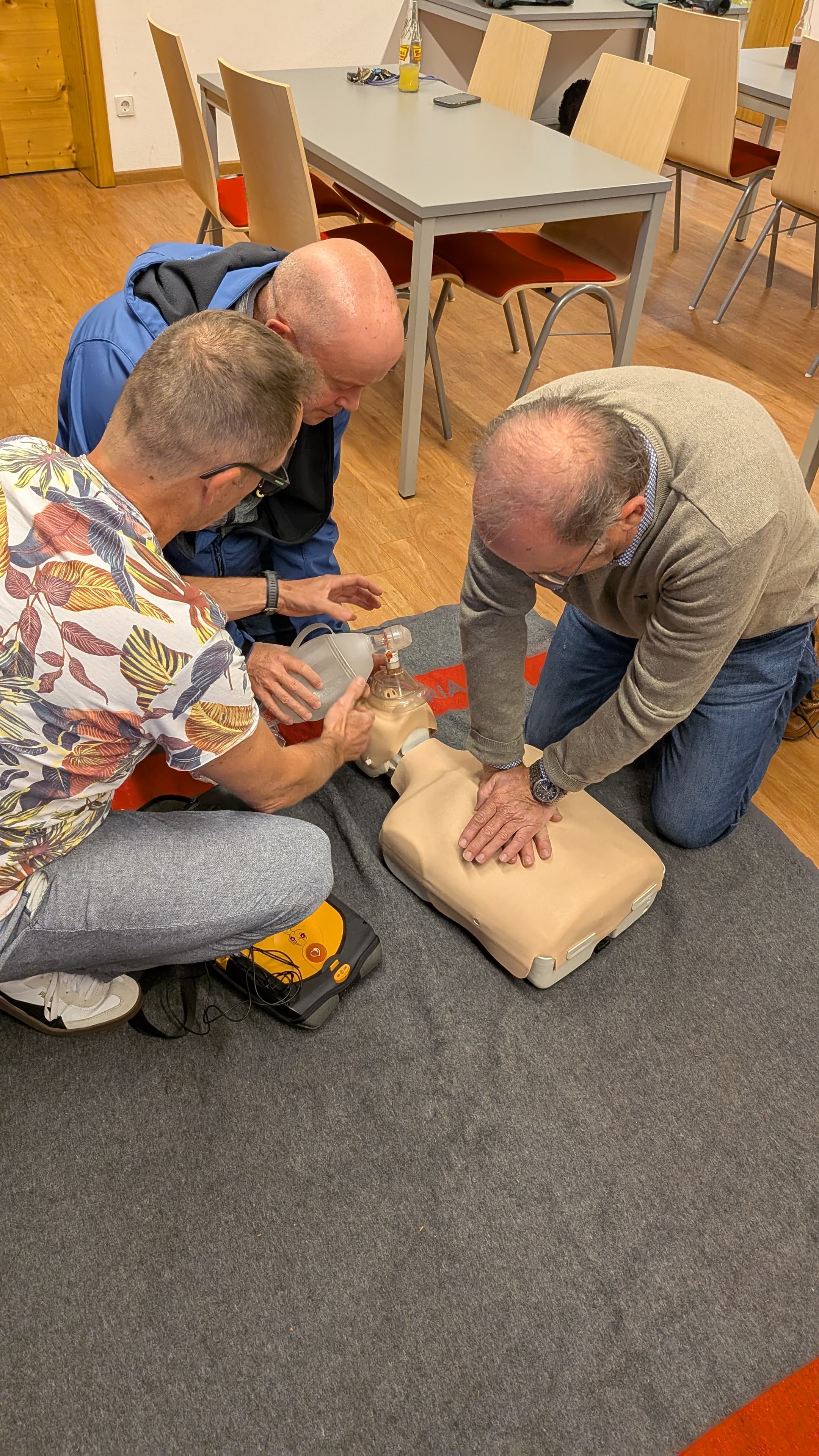 Nach einer kurzen Präsentation wurde das Equipment des Notfallrucksacks besprochen und die Reanimation konnte an einer Puppe trainiert werden.