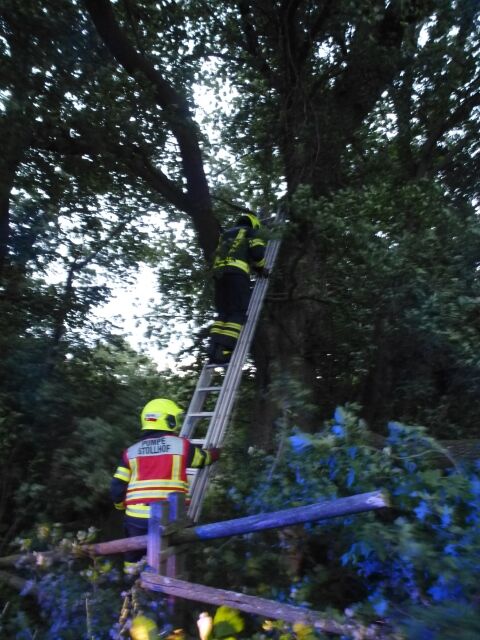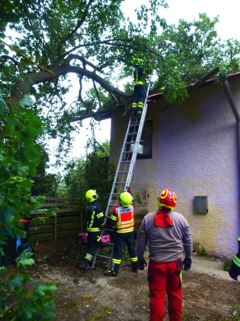 Aufgrund des starken Sturms war ein Baum auf das Dach eines Hauses gestürzt. Bevor mit der Entlastung des Dachs begonnen werden konnte, musste ein geparktes Fahrzeug von dem direkt darunterliegenden Parkplatz weggeschoben werden. In Anschluss wurde der Baum mit Hilfe der Seilwinde gesichert und in kleinen Stücken abgetragen, um weitere Schäden am Haus zu verhindern.